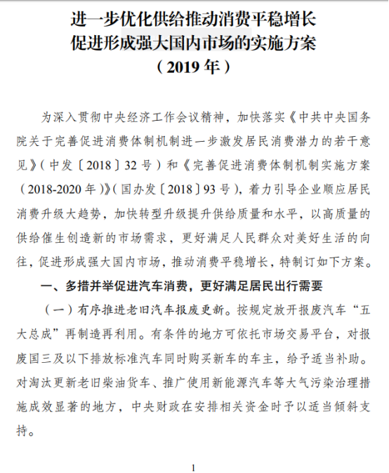 据悉,国家发改委于日前发布了2019年进一步优化供给推动消费平稳增长,促进形成强大国内市场的实施方案。其中第一条到第六条内容关于促进汽车市场发展,具体信息如下: