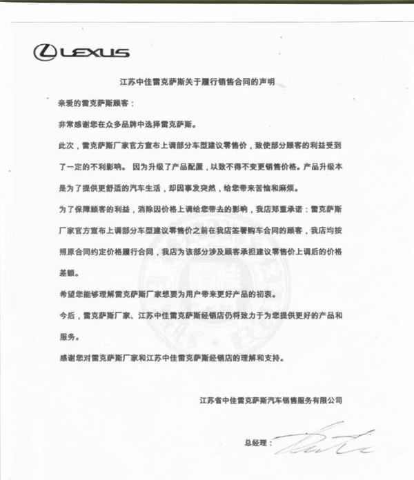 江苏中佳雷克萨斯4S店今日发布声明称,按照原合同约定价格履行合同,自愿承担官方上调价格后的差额,前提是在涨价前签订订购车合同。