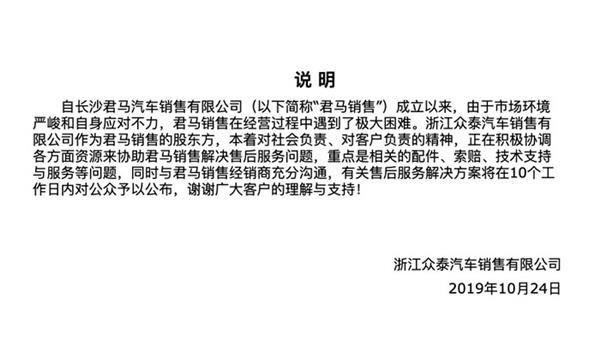 【AC汽车讯】10月25日消息,2019年10月24日晚间,据好车之家透露,浙江众泰汽车销售有限公司(以下简称:众泰或众泰汽车)发布《说明》,“正积极协调各方面资源来协助君马销售解决售后服务问题。”
