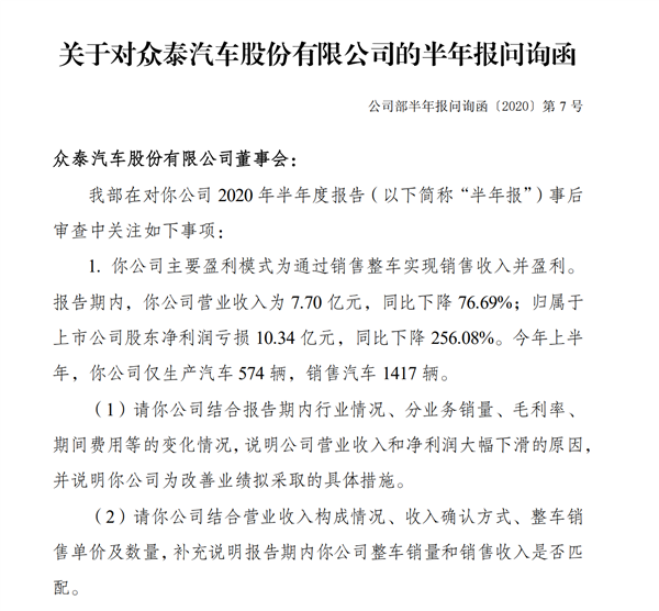 9月14日,众泰汽车发布公告,称公司收到深交所关于其半年报的问询函,要求众泰汽车解释包括业绩下滑等在内的多个问题。