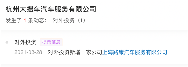 天眼查显示,3月28日,杭州大搜车对外投资新增一家公司,为上海路康汽车服务有限公司。