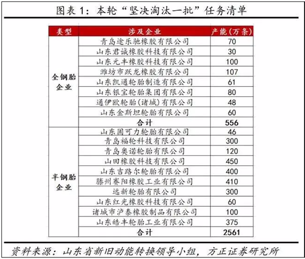 日前,山东省印发了关于《全省落实“三个坚决”行动方案(2021—2022 年)》的通知,有18家轮胎企业的产能将被淘汰。据方正证劵研究所数据显示,将淘汰产能包含556万套全钢胎产能,2561万套半钢胎产能。