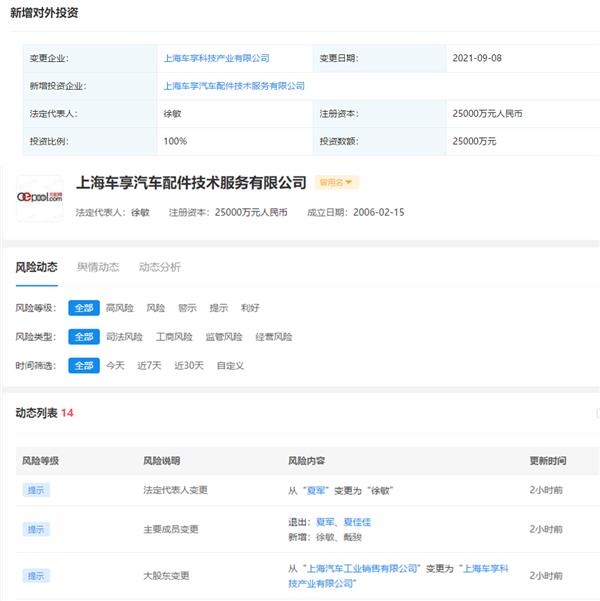 同时,车享配母公司完成多项变更:一是法定代表人变更,二是主要成员变更;三是大股东变更。