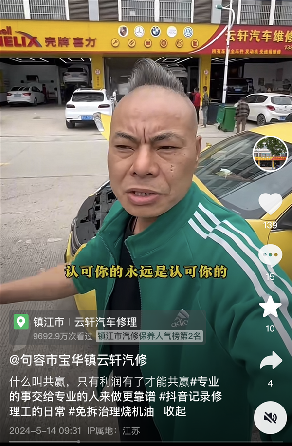 一位精神状态非常美丽的老板,大号@句容市宝华镇云轩汽修,小号@云轩报价王,粉丝加起来有十几万。
