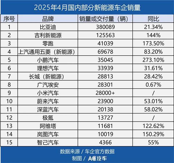 比亚迪延续强劲表现,4月销量达38万辆,同比增长21.3%,其行业领军地位难以撼动。