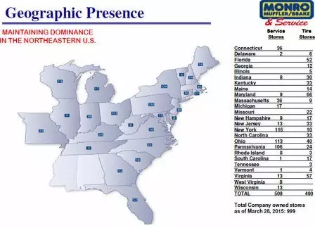 截止于2015年7月公司拥有25个州999个店(其中纽约、俄亥俄、宾法三州加起来有400+),另外在2015年4月的收购Car-X使得公司有另外拥有10个州的146家加盟店。