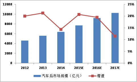 根据公安部的数据,国内汽车保有量在2015年达到1.72亿辆,并且伴随存量车车龄上升,国内汽车后市场规模预期将会逐步壮大。根据易观智库的数据显示,14年国内汽车后市场规模为6380亿元,并且预期至17年超过万亿。