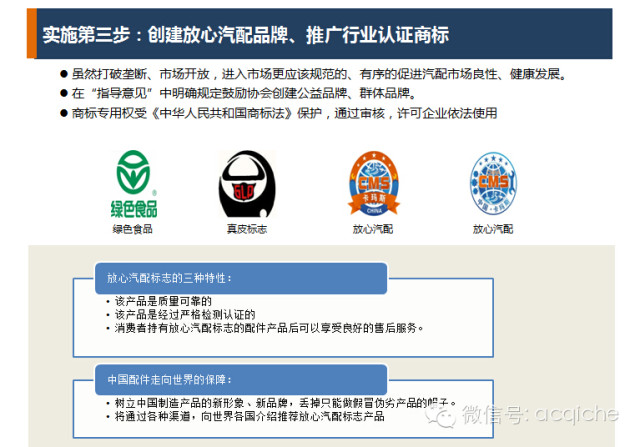 "同质配件"概念借鉴于美国汽车后市场的经验对于"质量相当"配件的定义,就是确保独立制造商生产的后市场零配件在质量上不输于原厂件,这也是检测认证的核心所在。通过独立第三方认证机构进行质量体系审核以及四大型式试验,对配件进行认证,拥有和原厂件相同的受信赖度。目前协会正借鉴国外经验开展检测认证活动,从研究配件导入先后次序着手,从而打破"原厂件副厂件"的壁垒。