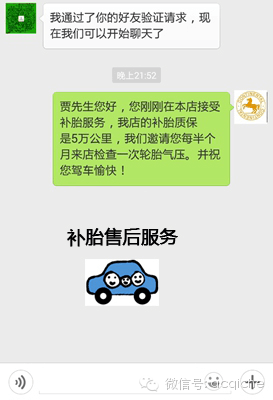 如果是补胎顾客,您能否做到这点(这条微信,你能否在顾客前脚刚出门,你就能发给他):