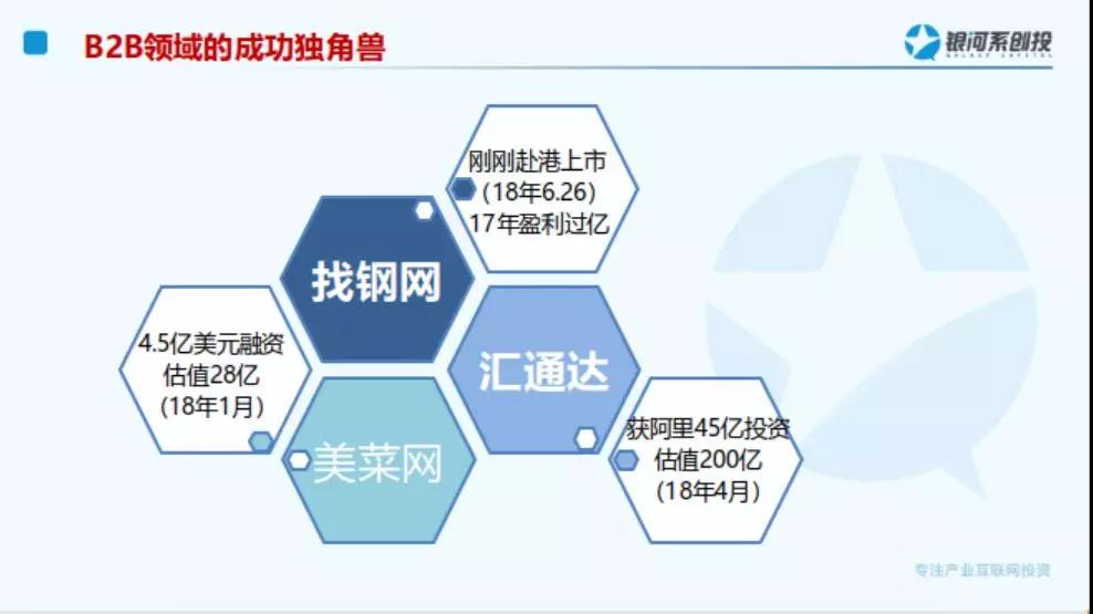 我们的衣食住行里,都有巨大的被科技互联网、人工智能,改造升级的机会。无论是菜市场、传统的夫妻老婆店,还是建材市场,都亟待科技的赋能。我先分享三个估值百亿以上的B2B公司案例。同时请大家思考为什么汽车配件的万亿市场里面还没有这样百亿以上的B2B公司?