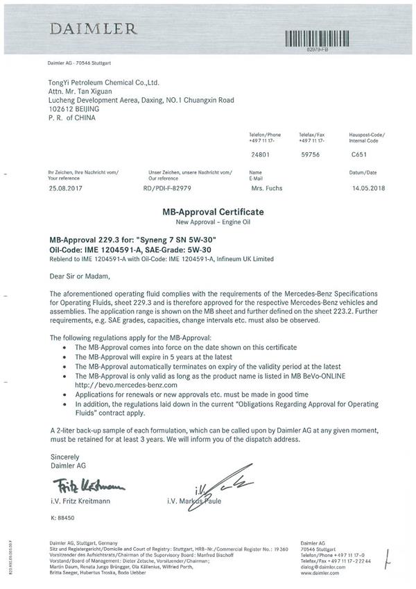 德国奔驰及其他主机厂所制定的汽车润滑油规范,主要是让润滑油厂家所生产的油品能够保证汽车的使用,在苛刻条件下真正起到保护引擎的目的,消费者购买润滑油时,一定要看生产厂家是否通过德国车厂的权威认证。 德国奔驰现在主要的机油使用标准有229.3、229.5,下面分析下各个标准的要求: 德国奔驰MB 229.3标准要求所测机油在奔驰指定的台架试验中,换油周期在20000公里到40000公里,或两年内换油。MB 229.3 针对测试的粘度等级与满足的ACEA的A3/B4级别差不多。可以说MB 229.3标准就是长效机油标准,而且机油的节油性能较之普通机油而言,节油1%。使用满足MB 229.3标准的机油,是省钱的不错选择。 德国奔驰MB 229.5标准要求所测机油在奔驰指定的台架试验中,换油周期在25000公里到50000公里,或三年内换油。MB 229.5 针对测试的粘度等级与满足ACEA级别与MB 229.3相同。德国奔驰MB 229.5标准是更长效机油,而且机油的节油性能较之普通机油而言,节油1.7%。与MB 229.3比较更节省0.7%。 — 技术创新 不断助力 — 除获得最新的奔驰认证外,统一石化旗下产品通过最新的国际标准认证,如API、ACEA等,得到宝马、捷豹、路虎、通用、大众、雷诺、标志雪铁龙等国际汽车制造厂商品牌OEM认证。 统一石化在不断钻研技术创新的同时精进生产设施的提升,依托全球认证和配套体系,统一石化必将为合作伙伴提供更有竞争力、更高性价比的产品和服务。 随着汽车后市场迈入发展新时代,统一将继续深挖汽车用品垂直细分领域,以更优质的产品、更全面的产品线服务经销商朋友和终端消费者,满足国内广大消费者的需求,推动汽车后市场的快速发展。