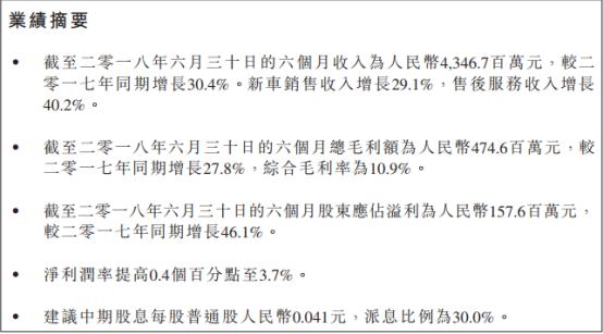 •截至2018年6月30日的六个月收入为人民币4,346.7百万元,较2017年同期增长30.4%。新车销售收入增长29.1%,售后服务收入增长40.2%。