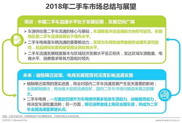 未来趋势:破除限迁政策、电商发展程度将深度影响流通发展,全面解除限迁,将会极大促进流通现状,国内二手车市场可能迎来真正的爆发;二手车电商线上全国车源直接购买业务的推广进程可能改变市场现有流通模式和竞争格局,促进全国车源的快速流通。