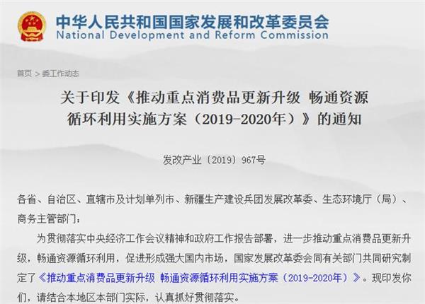 推动重点消费品更新升级 畅通资源循环利用实施方案(2019-2020年)