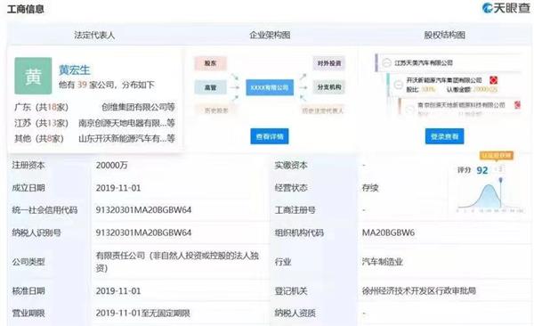AC汽车通过天眼查获悉:江苏天美汽车有限公司成立于2019年11月1日,注册资本2亿元人民币,经营范围包括汽车整车研发、制造、销售、售后服务;汽车零部件研发、制造、销售;新能源汽车的技术开发、技术转让等。公司由开沃新能源汽车集团有限公司100%持股,法人为黄宏生,而两者的背后则是商用车生产企业南京金龙,主线业务为生产新能源客车、新能源物流车等。
