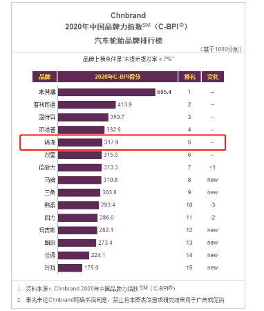 连续三年稳居中国品牌力指数轮胎品牌排行榜TOP5
