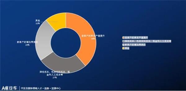 ▲2021年修理厂利润的主要三个来源渠道:老客户的单车产值提升(占比39%)、降低成本(占比27%)、新客户增加(占比23%)。