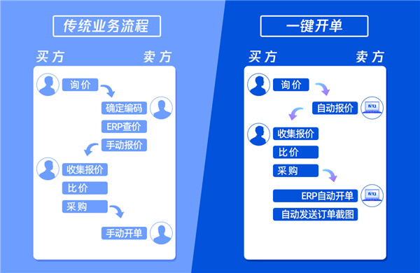 在传统汽配业务场景下,客户通过QQ发送采购需求给商家,商家需从ERP/EPC查询产品价格后向客户发送报价,客户确认采购后,商家再通过ERP开单,流程繁琐、效率低且整个业务流转环节无监督、无把控,导致客户体验差、管理难度大。