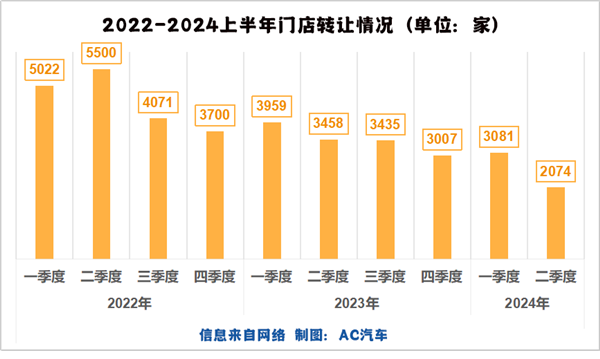 AC汽车在某同城生意转让一栏中,统计了全国32个主流城市转让数据显示:今年上半年整体门店转让数量约5155家,环比去年三四季度下降近20%,同比去年上半年下降约30%。
