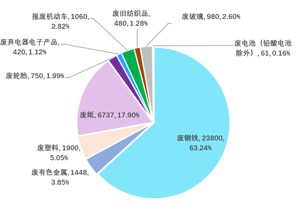 2023年我国主要品种再生资源回收量及占比情况(单位:万吨)
