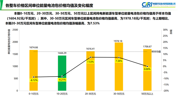 今年10月,中保研公布了第18期动力电池零整比的数据,其中59款纯电新能源样本车型中,动力电池包单件零整比均值为50.96%;单位能量电池包价格均值为1604.92元/千瓦时。