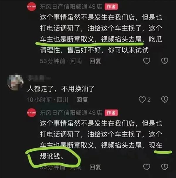 更令岳先生气愤的是,该4S店在短视频平台的评论区称,已经为岳先生更换了机油,并称岳先生“掐头去尾”“恶意剪辑”“想要讹钱”。