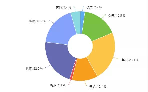 虽然美容贡献的营业收入很低,但23.1%的门店认为这是利润率最高的项目;其次是维修(22%)和钣喷(18.7%)。