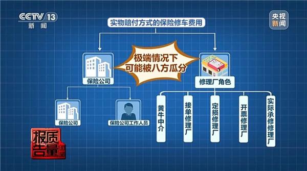 视频报道的两个案例,都涉及到了两个乱象,一是部分财险公司与无资质修理厂合作,有些修理厂甚至是个体工商户的皮包公司,无设备无维修技师,只有一台开票的机器;二是根据央视新闻整理的图表显示,一份赔款极端情况下会被八方瓜分,而实际维修的一方可能拿到的最少。